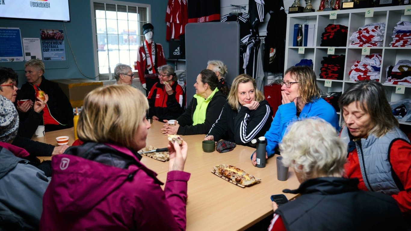 Där hade hon fel. Nu, knappt ett år senare, ger hon sig fortfarande ut på planen två gånger i veckan. Så länge det inte är kallare än fem minusgrader – då konstgräset blir för halt och skaderisken för stor – möts spelarna på Enskede IP. De är allt som allt ett fyrtiotal kvinnor i åldersspannet 60–84 år.