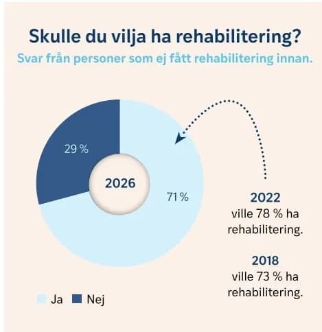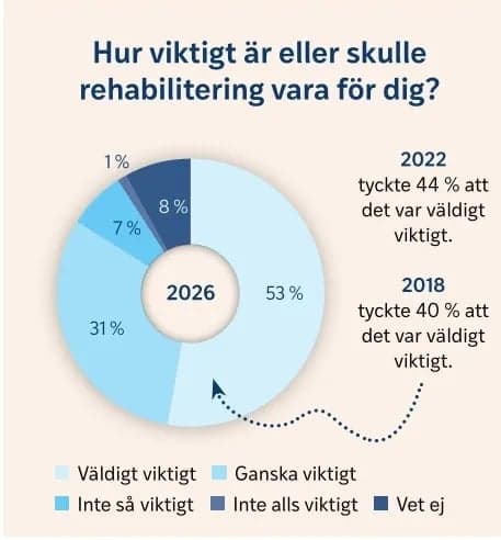 En majoritet, 84 procent, uppger att rehabilitering är viktig eller mycket viktig för deras liv och hälsa. Det är en tydlig ökning jämfört med både 2022 och 2018.